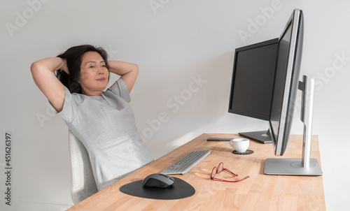 Working at home Asian mature woman taking a break from small business remote work at computer desk thinking of early retirement or success of online e-commerce. Chinese middle aged lady in her 50s