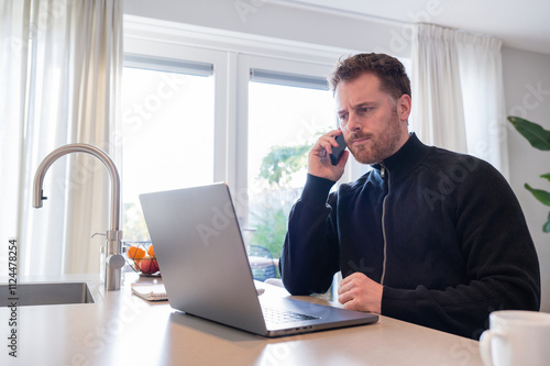 working at home in the kitchen. caucasian male sitting at the kitchen counter behind his laptop working and communicating.
