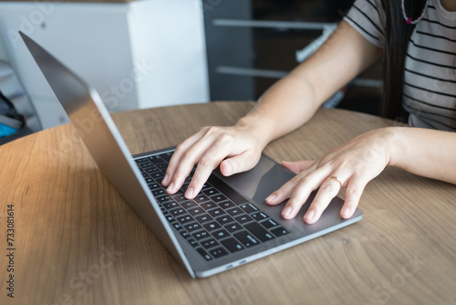 Working from home on laptop while typing chat to customer communicates on internet in home office