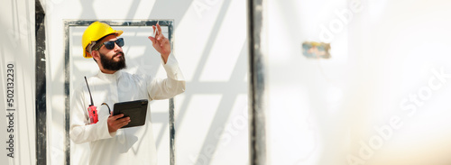 working on tablet and walkie talkie. Arab man Construction civil engineer use digital tablet computer and wearing in safety hard hat helmet working on Building Site.