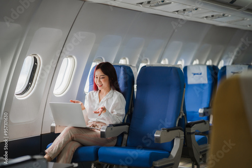 Working on the Go: A young woman effortlessly blends work and travel, using her laptop in the comfortable confines of an airplane cabin. This image evokes a sense of freedom, productivity, and the se