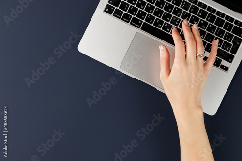 Working space with laptop on blue background. Top view. Distant work. Hand printing on laptop