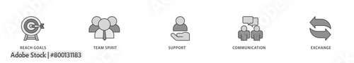 Working together icons set collection illustration of collaboration, reach goals, team spirit, support, communication, and exchange icon live stroke and easy to edit