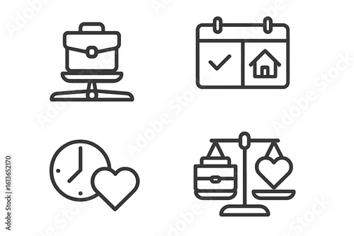 Work-life balance icon set. Outline icons for harmony between career and family. Symbols of scales, briefcase, home, heart, calendar. Healthy lifestyle and time management concept.