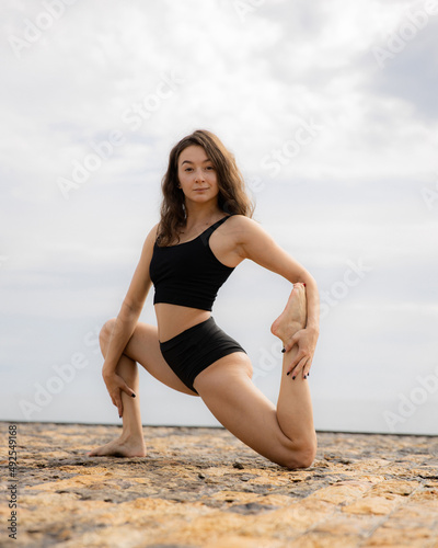 Workout on the beach. Sport, fitness, wellness concept. Attractive sportive woman workouts outdoor. Healthy lifestyle. Strong fit body. Woman wearing black sportswear. Copy space. Bali