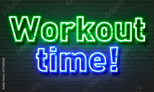 Workout time neon sign on brick wall background.