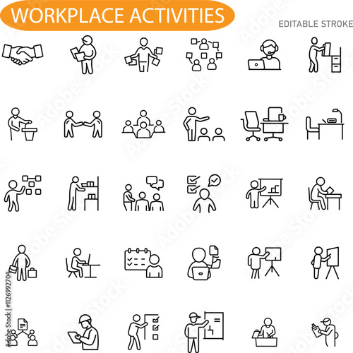 Workplace Activities Icons Depicting Office Tasks, Teamwork, and Collaboration