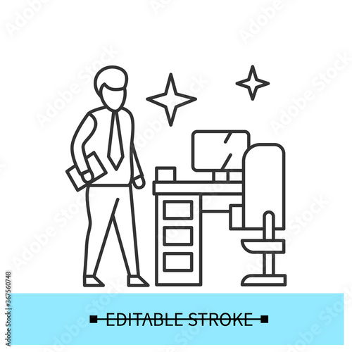 Workplace disinfection icon. Man beside clean office desk line pictogram. Concept of corona virus employee health safety recommendations and hygiene at work. Editable stroke vector illustration