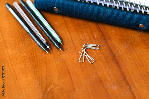 Workplace office with wooden table . Top view from above of notebooks with pens and clips. Flat lay, Business-finance or education concept with copy space.