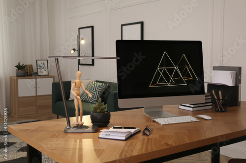 Workplace with computer on wooden desk in light room. Modern interior design