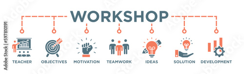Workshop banner web icon vector illustration concept with icon of teacher, objectives, motivation, teamwork, ideas, solution, and development