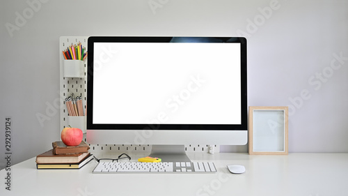Workspace empty screen of computer, book, apple and office supply on table.
