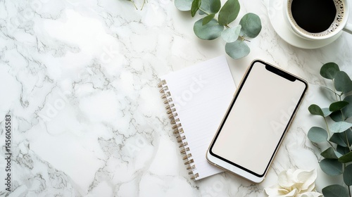 Workspace Mockup Phone, Notebook, Coffee, Eucalyptus on Marble, Flat Lay, mockup, workspace