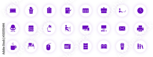 workspace purple color silhouette icons on light round buttons with purple shadow. workspace vector icon set for web, mobile apps, ui design and print