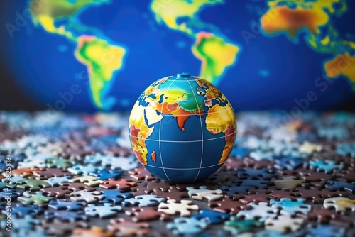 World Autism Awareness Day, small figure of the globe, planet earth, colorful puzzle pieces, logic day
