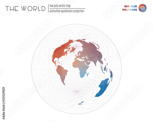 World map in polygonal style. Azimuthal equidistant projection of the world. Red and blue colored polygons. Stylish vector illustration.