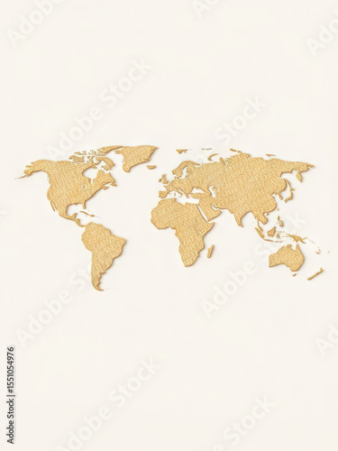 World map made of textured golden material on light background, showcasing continents in minimalist and elegant design