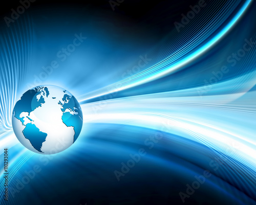 World map on a technological background, glowing lines symbols of the Internet, radio, television, mobile and satellite communications.