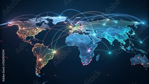 World map on a technological background, glowing lines symbols of the Internet, radio, television, mobile and satellite communications.Global network connection over the world. 3d rendering