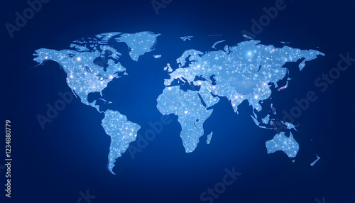 world map with global network and connectivity concept, blue background, collage style, with white tones