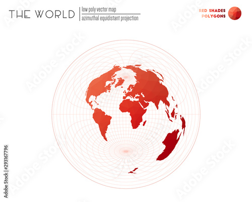 World map with vibrant triangles. Azimuthal equidistant projection of the world. Red shades colored polygons. Elegant vector illustration.