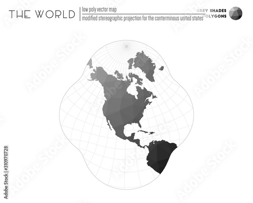 World map with vibrant triangles. Modified stereographic projection for the conterminous United States of the world. Grey shades colored polygons. Beautiful vector illustration.