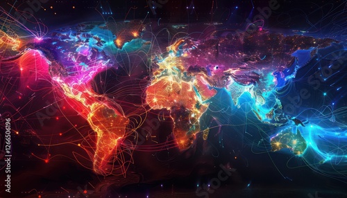 World night view futuristic international telecommunication network, concept about global connection and information, background with colourful dynamic gradient line flows connecting between countries