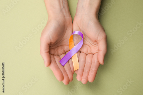 World Psoriasis Day. Woman with orange and orchid ribbon as symbol of support on olive color background, top view