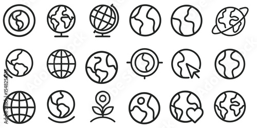 World vector illustration, globe icon set, Earth symbol, planet icon, global map, geography, international, travel concept, environment, nature, sphere, earth science, vector illustration.