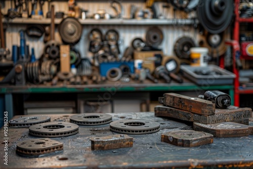 Worn Brake Pads and Mechanics Tools on Workbench in Auto Repair Shop