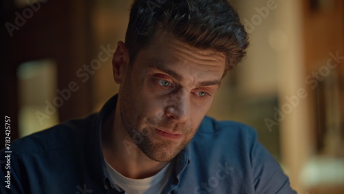Worried freelancer talking online late at home closeup. Nervous man video call