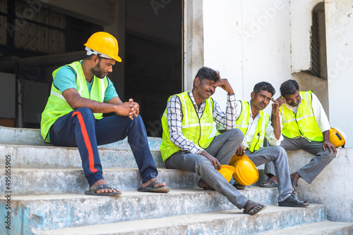 worried industrial workers sitting outside the factory due to closure - concept of job loss, unemployment and blue collar jobs