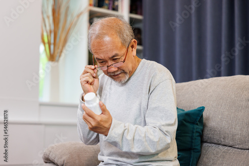 worried senior Asian man taking prescription medicine at home. older man reading drug label with farsightedness problem.