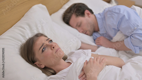 Worried Young Woman Lying in Bed