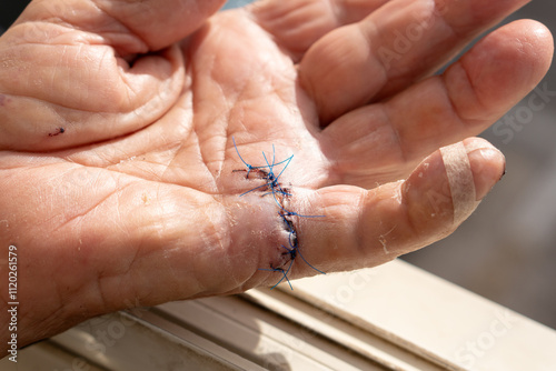 Wound healing visualization of hand with laceration and stitches. Female hand with sutured wound on day 3, day 10 and 4 weeks after the injury. Side by side healing stages or phases. Selective focus.