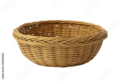 Woven wicker basket with braided rim and textured surface isolated on a transparent background rattan