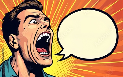 Wow pop art male face. Closeup of man with open mouth rising his hand screaming announcement and empty speech bubble. Vector background in comic retro pop art style. Invitation poster. High quality