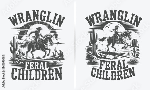 Wranglin' Feral Children - Vintage Cowboy Riding Horse in Desert Landscape Graphic