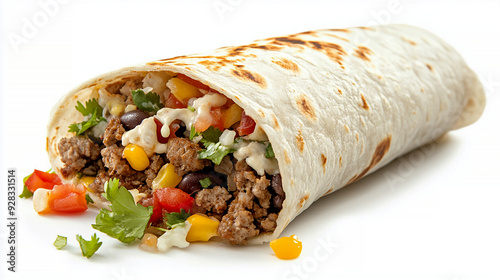 wrapped burrito filled with beans, rice, meat, and vegetables, isolated on a white background