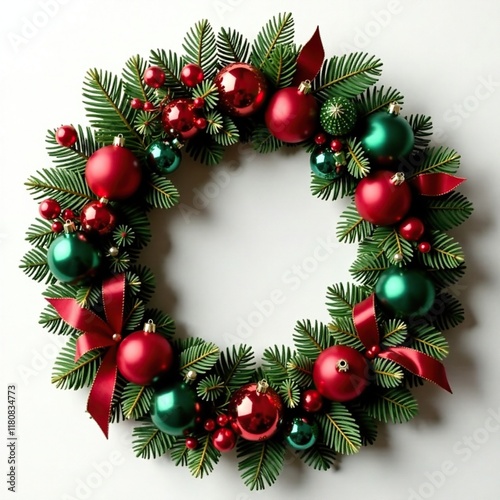 Wreath made of red and green ornaments and ribbons, evergreen, berries, garland