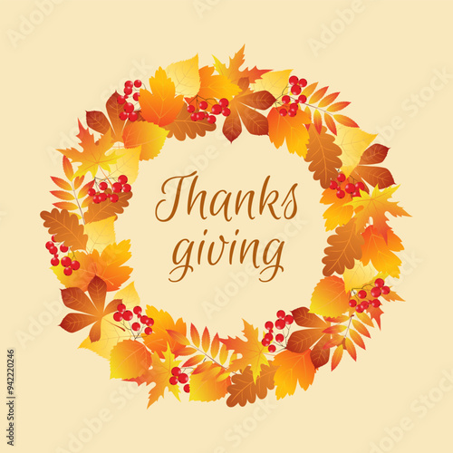 Wreath of autumn leaves and rowan berries for Thanksgiving.Holiday quote "Happy Thanksgiving".Template design for card,poster,banner.Vector illustration.