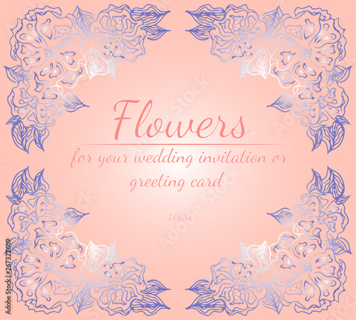 Wreath of roses or peonies flowers with red, carmine, sundown, fringy flower gradient colors. Floral frame design elements for your wedding invitation and greeting card. Hand drawn. Line art. Sketch