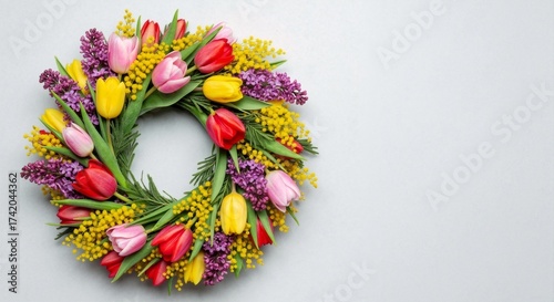 Wreath of spring flowers with colorful tulips, lilac and mimosa. Top view flat lay on a gray background. Holiday celebration concept with copy space