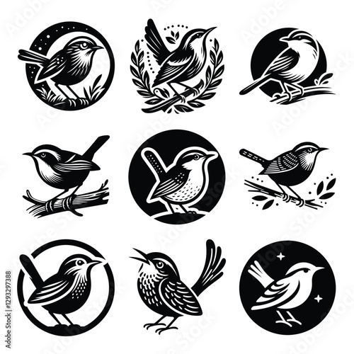 Wren bird vector silhouette icon logo set clipart illustration & drawing black & white
