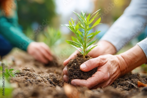 Wrinkled hands holding fertile soil and a young tree seedling, planting a new tree in the field with a blurred person in the background