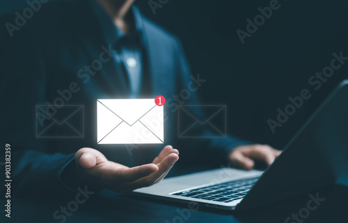 write text on the web, send an information message email from the laptop. business communication contact newsletter concept. marketing social media. icon new email, smart SMS mail on digital.