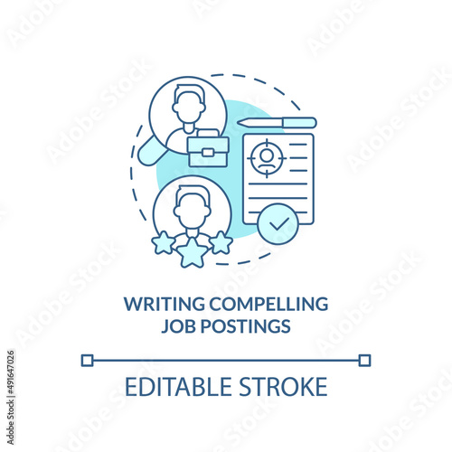 Writing compelling job postings turquoise concept icon. HR skills abstract idea thin line illustration. Isolated outline drawing. Editable stroke. Arial, Myriad Pro-Bold fonts used
