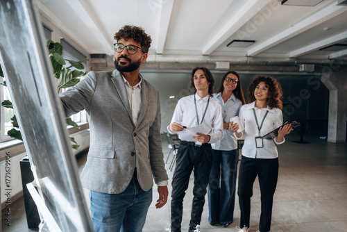 Writing data on the board, explaining stuff. Four office workers are together, employees at work