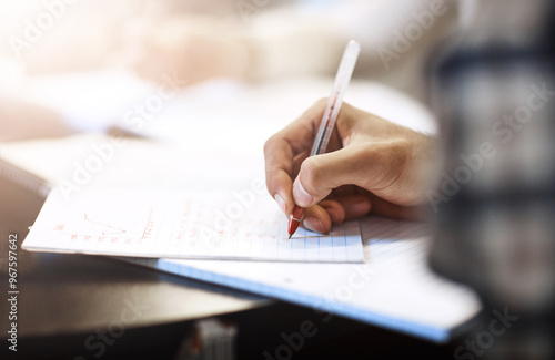 Writing, education or hand of person in college for learning, notes or accounting course. Student, books or studying at table for exam preparation, finance assignment or lesson on stats in university