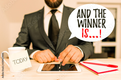 Writing note showing And The Winner Is. Business concept for announcing who got first place at competition or exam